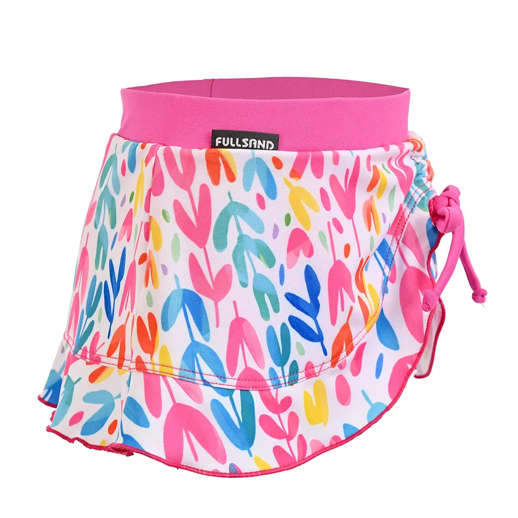 Ideal para los dÃas de playa y vacaciones. Esta skort para bebé niña, cuenta con una pretina elástica con jareta que proporciona un ajuste cómodo y seguro. Su tejido certificado UPF50+ protege del sol, mientras que el secado rápido facilita la transición entre el agua y la arena. Presenta un corte asimétrico tipo pareo con un estampado colorido en el faldón y olan en el ruedo que aporta frescura y estilo. La pretina y el calzón lisos equilibran el diseño, y el ajustador frontal permite modificar el largo del faldón para mayor comodidad. La etiqueta tab bordada añade un detalle de calidad y autenticidad.
