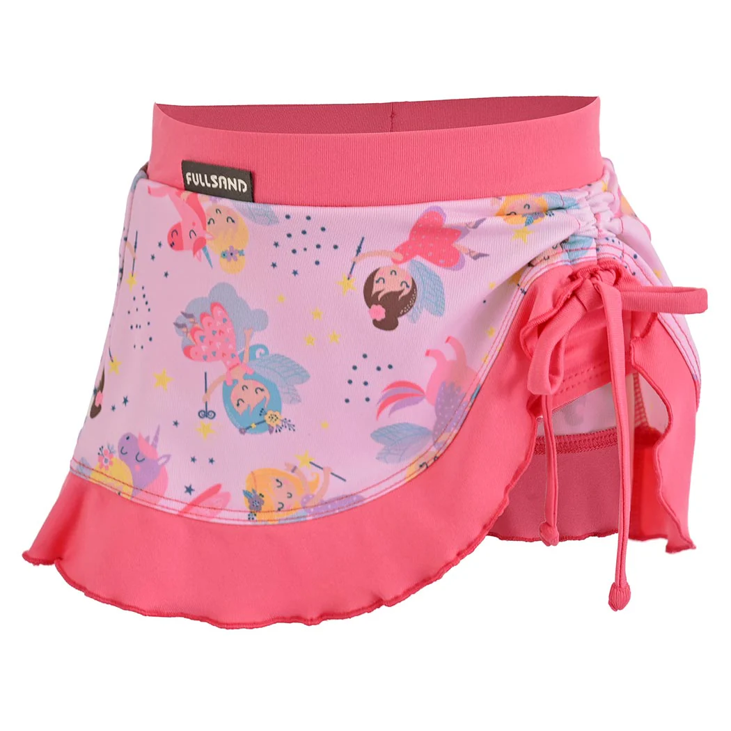 Haz que cada dÃa al sol sea mágico con nuestro skort para bebé niña, una prenda versátil que funciona como traje de baño, con tela de secado rápido y certificación UPF50+ para máxima protección solar. Su diseño tipo pareo con corte asimétrico y encantador estampado de hadas en el faldón aporta un toque divertido y femenino, mientras que la pretina elástica con jareta asegura un ajuste cómodo. El calzón interior, la pretina y los olanes se presentan en tela lisa para un acabado armonioso. Incluye ajustador frontal para regular el largo del faldón y etiqueta TAB con logo bordado. Ideal para dÃas activos al aire libre con estilo y confort. Disponible en tallas de 12 a 24 meses y 3 a 4 Años.