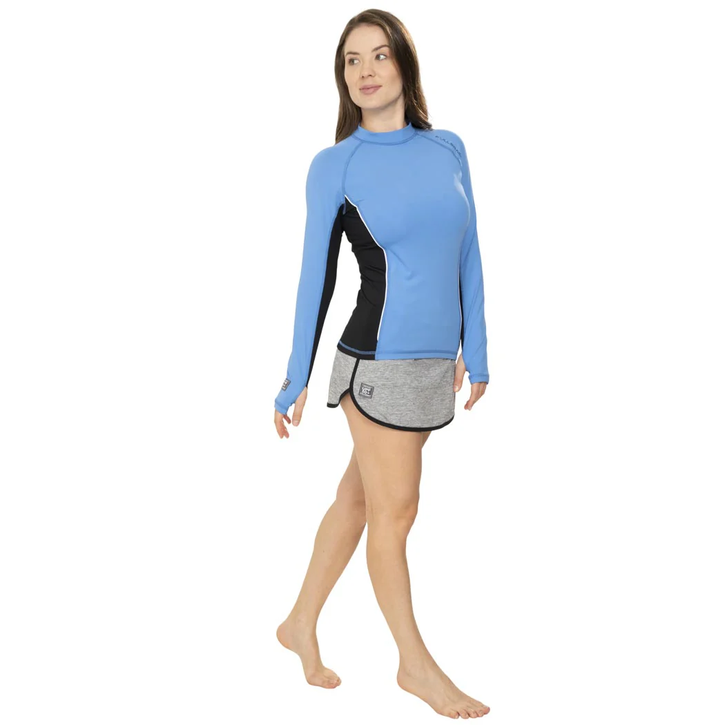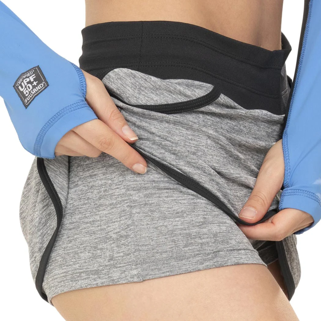 ¡Brilla en el sol con total comodidad! Falda skort para mujer en gris claro jaspeado con short interno que proporciona comodidad incomparable. Certificada UPF50+ ofrece protección solar confiable para todas tus aventuras al aire libre, deportivas y acuáticas. Secado rápido te mantiene fresca, corte en lÃnea A jaspeada realza tu silueta, etiqueta TAB con logo bordado en pretina añade detalle premium, encintado en ruedo y simulador de bolsa funcional. Areta interna de ajuste garantiza cintura segura. ¡La prenda esencial para tu estilo activo!