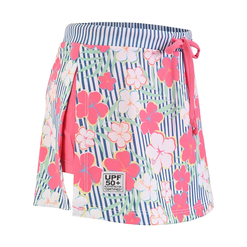 Que estas vacaciones, la diversión no se detenga para tu pequeña. Te presentamos esta coqueta faldita skort que esta confeccionada con tela sublimada motivo Jamaica y en pretina con motivo vertical, las jaretas en lindo color salmón, esta prenda tiene integrado un short debajo, para que realice todos los juegos y actividades super divertidas en la playa o la alberca, como lo desee. Con nuestra recomendación UPF50+, esta prenda es ideal para proteger la piel de tu pequeña, es de tela fresca y ligera que no guarda olores y aparte es de secado ultra rápido.